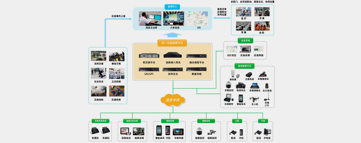 建立統一的音視頻應急指揮平臺,使各類支撐系統有效互聯互通,基于GIS系統,打破信息孤島,實現應急指揮的“看得見、叫得通、調得動”,確保應急指揮處置快速、及時、高效。